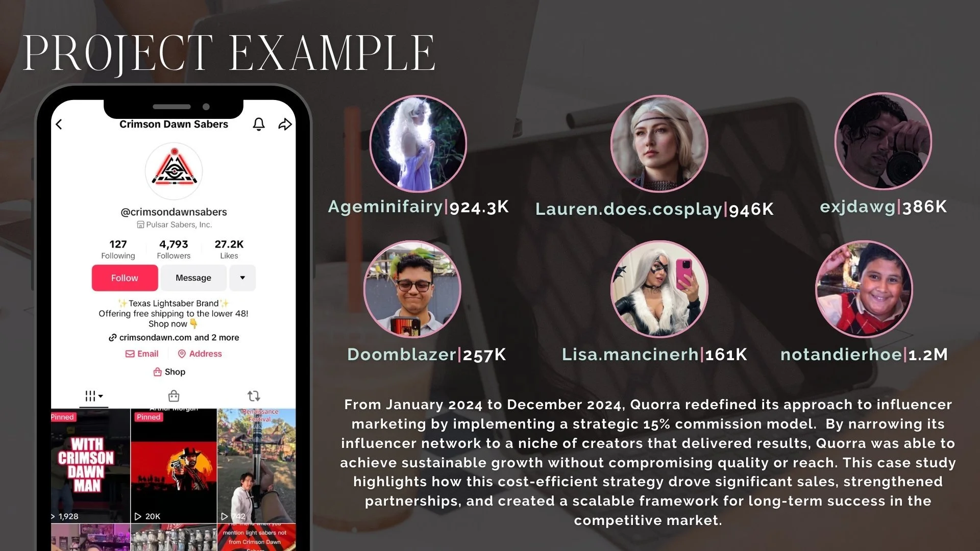 “Quorra made our lightsabers feel like the stars of the show. Their influencer picks matched our exact customer base, and the campaign paid off with real sales. The videos are still driving traffic months later.” — Crimson Dawn Team